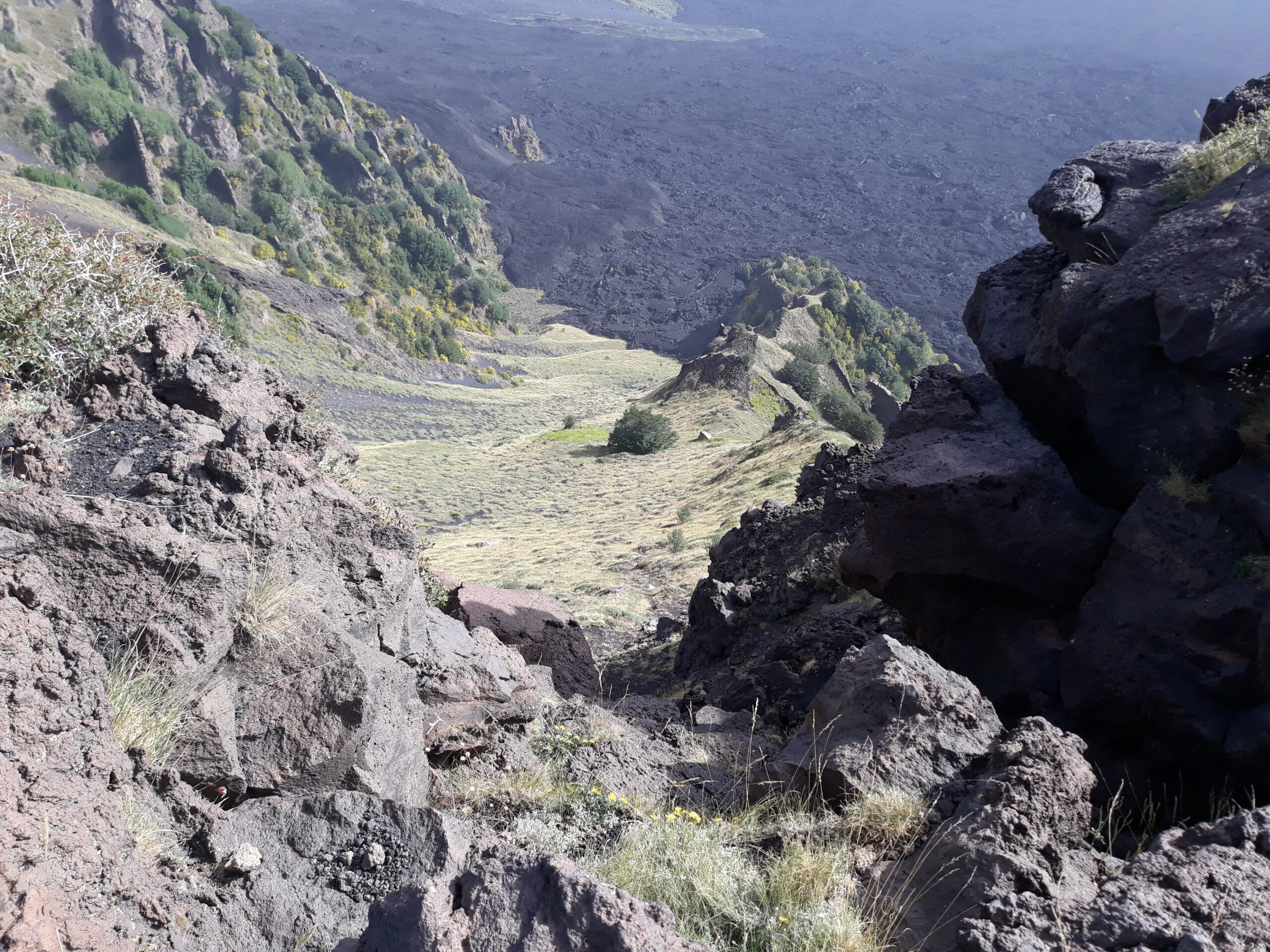 Arriviamo fino all’affaccio sulla spettacolare Valle del Bove, a circa 2200 metri: davanti a noi i resti degli antichi edifici vulcanici.