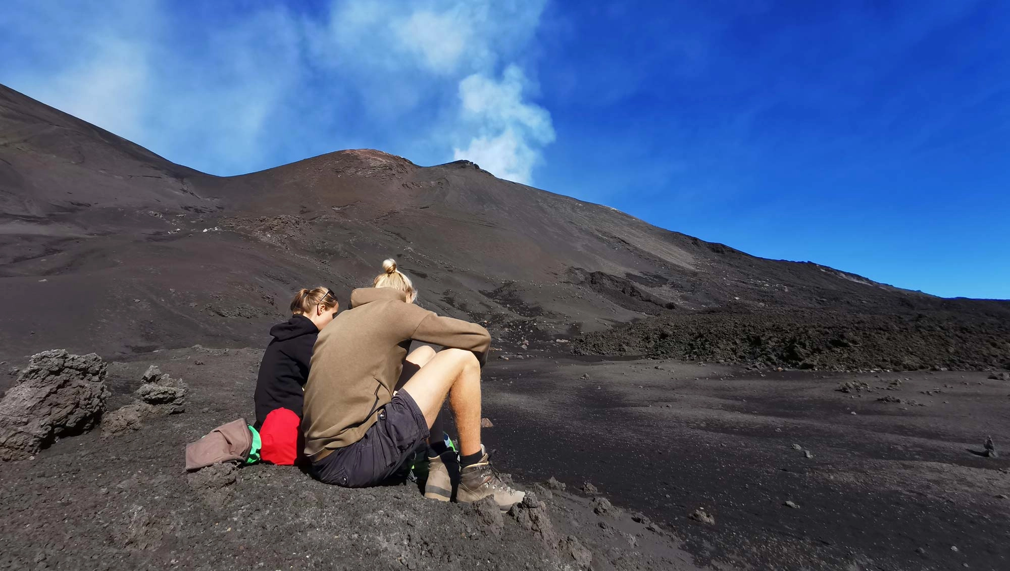 Poi si cambia ritmo: discesa diretta fino alla base dei crateri Bocca Nuova e Sud-Est, tornando a quota 3000 metri. Pausa veloce. Il tempo di mangiare qualcosa e si riparte.