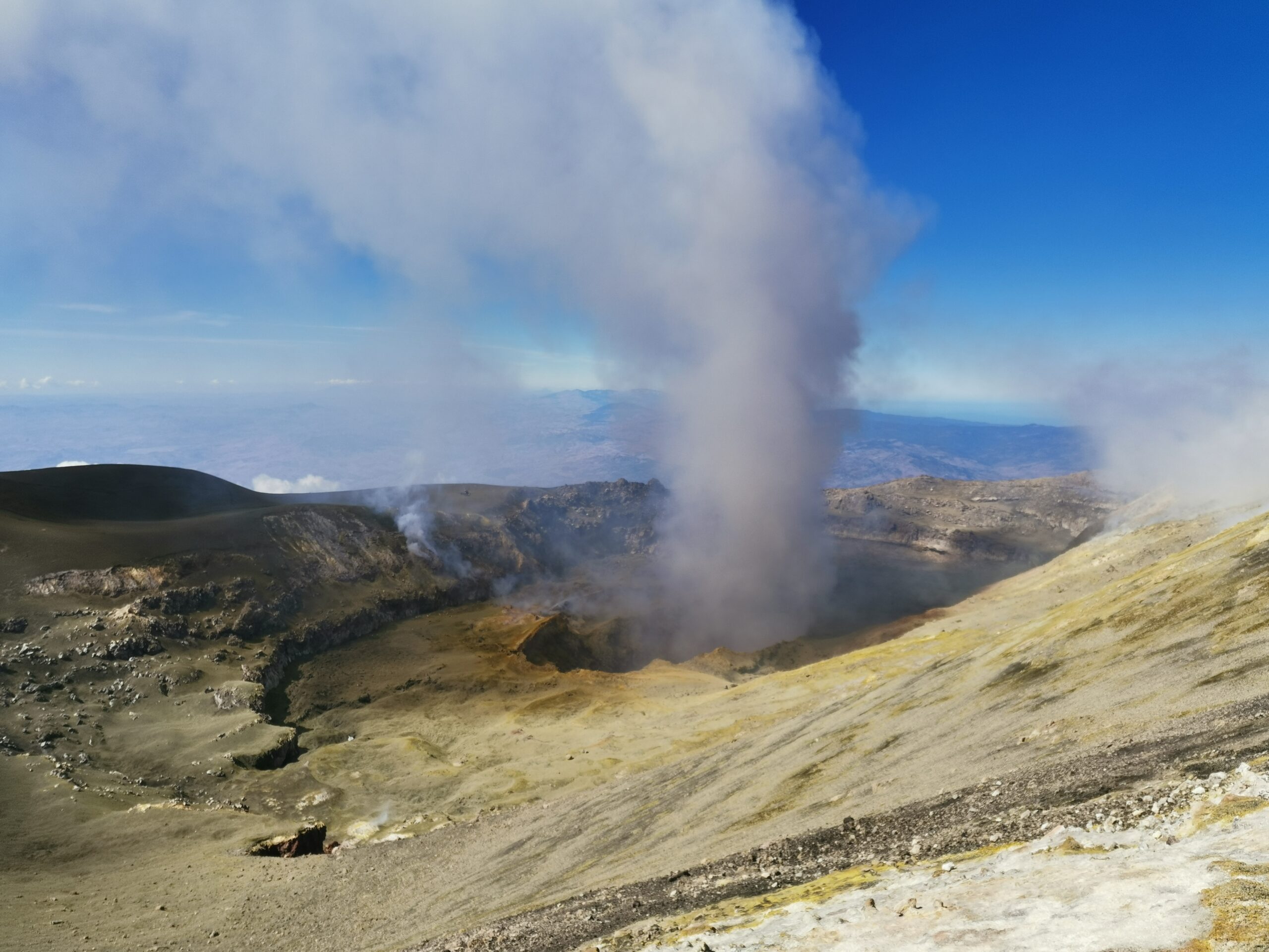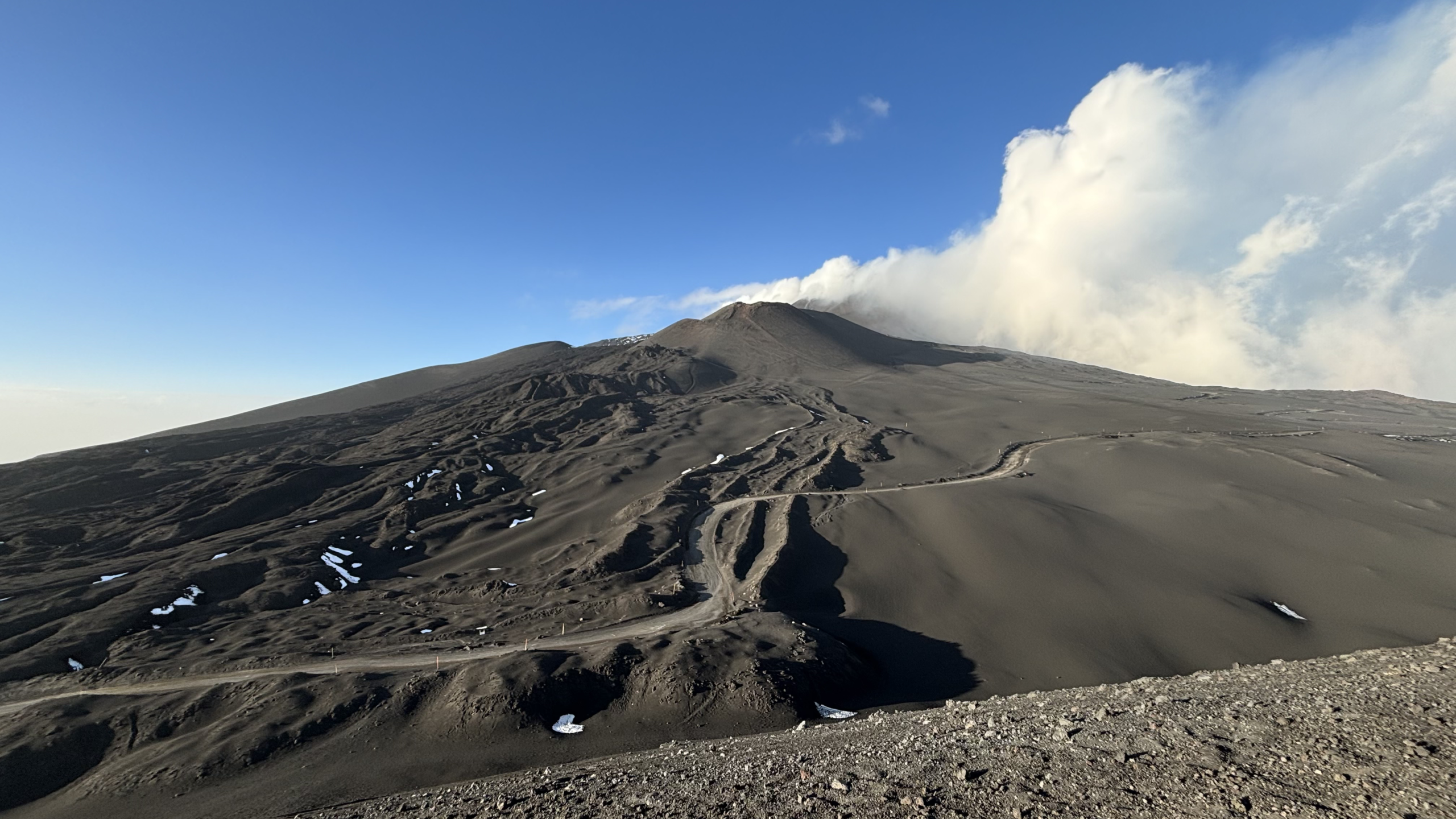 Poi si scende lungo la direttissima, fino alla base dei crateri Bocca Nuova e Sud-Est, tornando a quota 3000 metri.